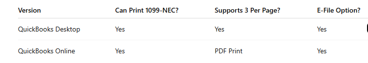 The answer is YES — both QuickBooks Desktop and QuickBooks Online support 1099-NEC printing and e-filing.